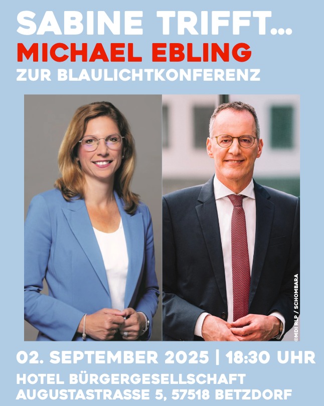 Herzliche Einladung zur Blaulichtkonferenz mit Sabine Bätzing-Lichtenthäler und Gastredner Michael Ebling, Staatsminister, u. a. zu den Themen innere Sicherheit, Rettungswesen und Katastrophenschutz.